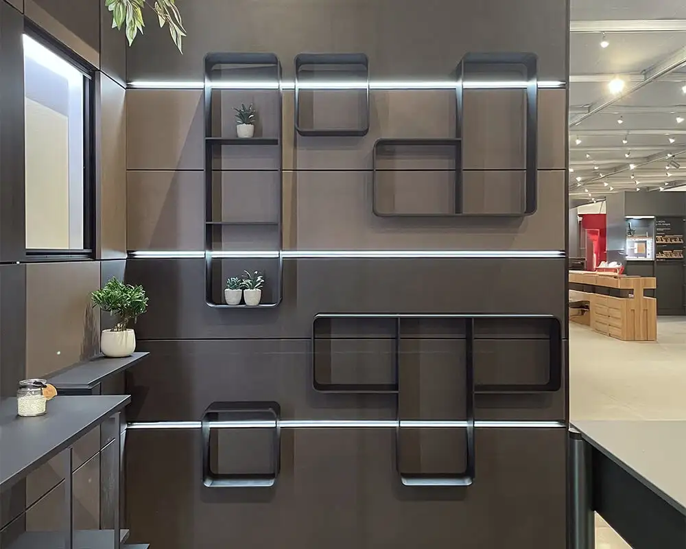 Conçu pour les espaces cuisine et séjour, Modus EVO – Line 03 d'Ossicolor permet de créer des espaces d'exposition ordonnés et raffinés, parfaits pour objets, accessoires et éléments décoratifs. La disponibilité en différentes configurations, avec deux profondeurs (110 mm et 150 mm), permet une conception flexible et personnalisée.